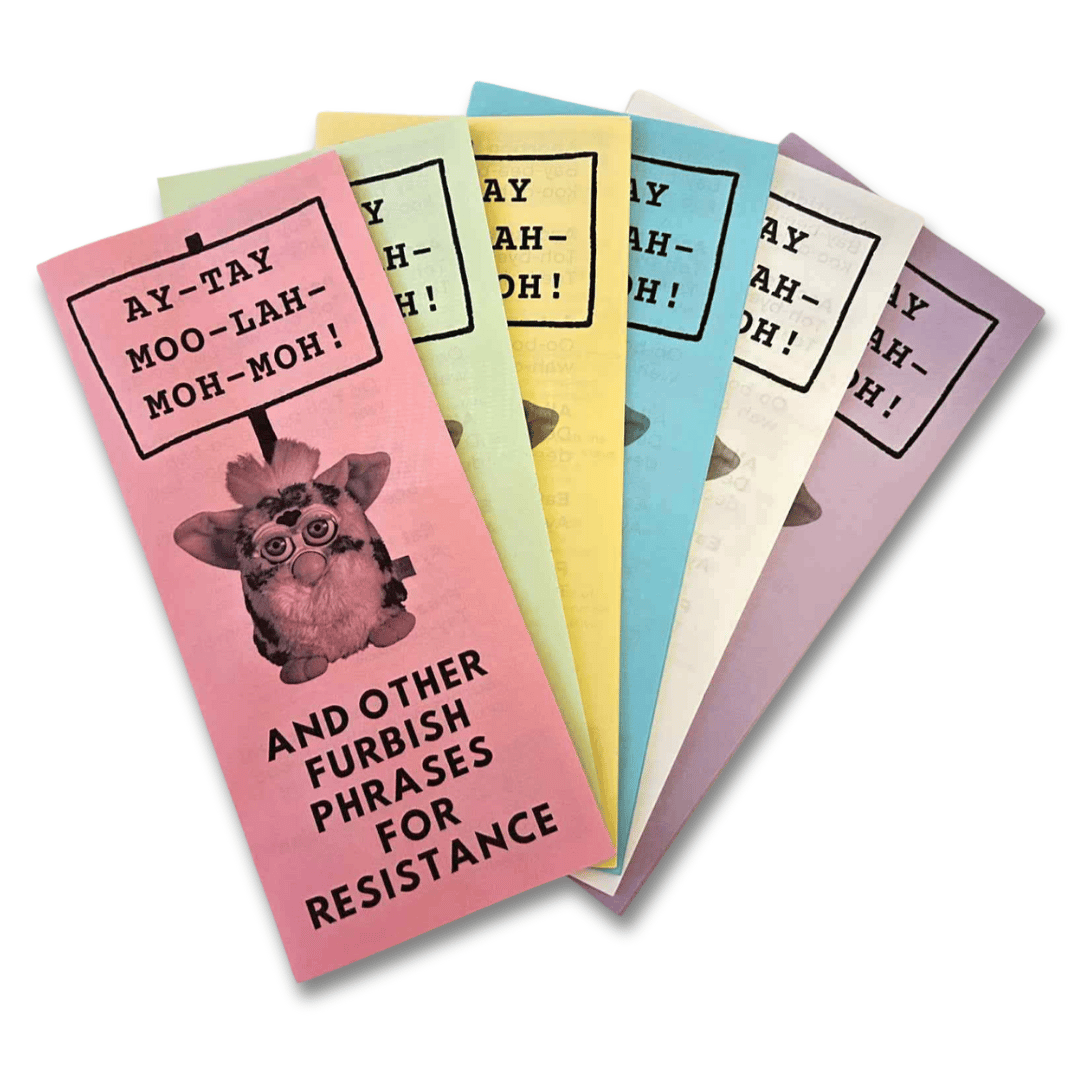 This pamphlet includes 15+ phrases for resistance translated by me into Furby's native language, Furbish. Topics include trans rights, Gaza, climate change, and more.